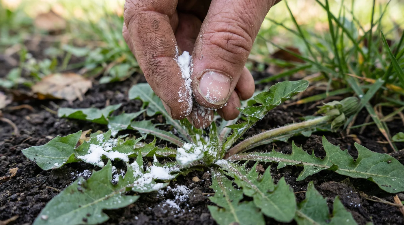 | 2 Esslöffel Backpulver (Natriumhydrogencarbonat) | Verursacht einen massiven osmotischen Schock in der Zellstruktur. Die Pflanze verliert schlagartig Wasser, die Pfahlwurzel trocknet von innen heraus aus. |